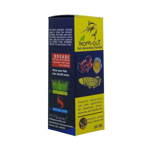 AQUATIC REMEDIES Worm Out is an anti-worm medication including worms in blood, liver, stomach, gill flukes, skin flukes, tape worm, flat worm, and planaria in shrimp tanks. Best deworming medication for Flower Horn, Arowana, Discus, Koi and all type of fish. Safer to shrimps and plants.