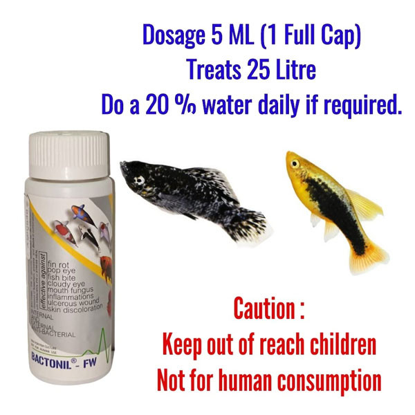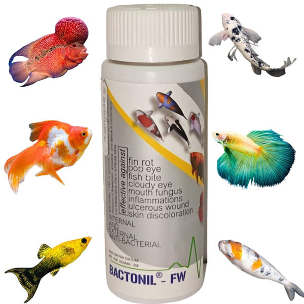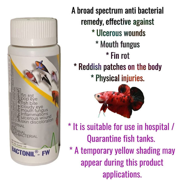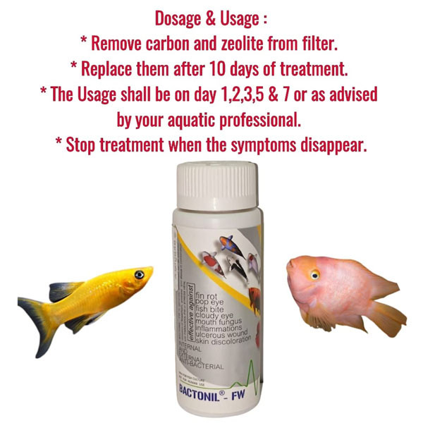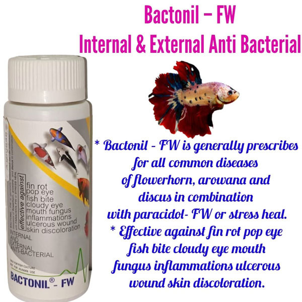 Bactonil – FW is generally prescribes for all common diseases of flowerhorn, arowana and discus in combination with paracidol- FW or stress heal.