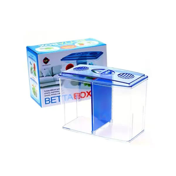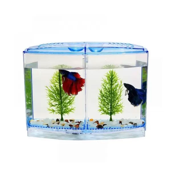 Good quality easy to use fighter home size 15 x 8, 5 x 14 cm mini small betta fish tank. Price inclusive shipping cost the central plate is removable for more space to hold more fish ideal for betta fighter fish small fishes and plant keeping the blue plate is added to prevent the betta fish to view each other so as to cut down the stress the bottom hole for easy changing water, just unplug the rubber stopper.