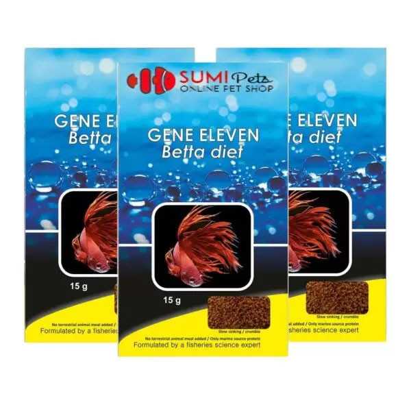 GENE ELEVEN Betta Diet Premium sinking crumbles food for all fighter fishes like betta fish. Gene eleven betta diet 1, 25gm aquarium fish food 0. 5Mm premium sinking crumbles food for young fighter fishes. Analysis – protein – 43 percent minfat – 6 percent min. Fibre – 4 percentash – 16 percentmoisture – 10 percent max set of 2 packs of 25ml each. Caution – keep out of reach of children. Remove uneaten feed after feeding time. Keep the product in dry place at room temperature. Not for human Analysis: Protein: 45% min Fat: 6% min. Fibre: 4% Ash: 12% Moisture: 10% max