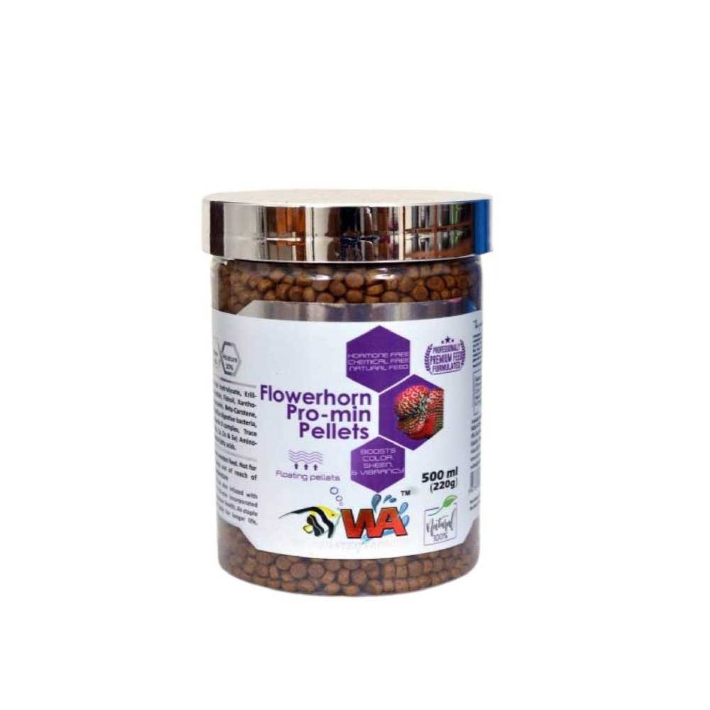 Pro-min is a staple feed but also infused with natural color enhancers. Pro-min incorporated with active minerals to improve health. As staple diet Pro-min can be fed daily for longer life. Feed type: Floating Pellets Ingredients: Fish meal, Squid meal, Fish hydrolysate, Krill-meal, Shrimp meal, Soy lecithin, Fishoil, Xantho-phyll, Astaxanthine, Phycocyanin, Beta-Carotene, Spirulina, Yeast powder, Bacillus digestive bacteria, Vitamin A, D, E , K & C, Vitamin B complex, Trace minerals (Cu, Na, Fe, I, Mn, Co, Zn & Se) Amino-acids (18 types), and Essential fatty acids. Instruction: Feed twice a day. Remove uneaten feed. Not for human consumption. Keep out of reach of children. Keep at room temperature. Nutritional Fact: Protein- 46% Fat- 8% Fibre- 5% Moisture- 10% Packing: 220g (500ml)